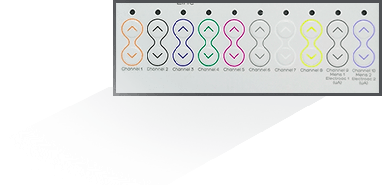 São 10 Canais com Controle Independentes para as correntes: Aussie, Russa e Eletroacupuntura (mA); e 2 canais para a Microcorrente (µA) e Eletroacupuntura (µA)