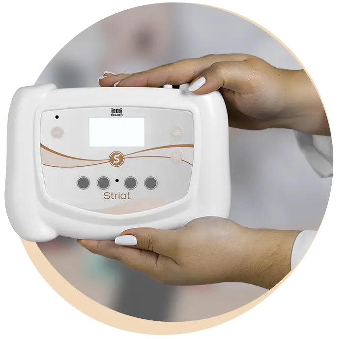 O STRIAT é um eletroestimulador transcutâneo e percutâneo de simples operação, desenvolvido para utilização nas áreas de estética, medicina estética ou por profissionais da área da saúde devidamente habilitados segundo legislação vigente do país.